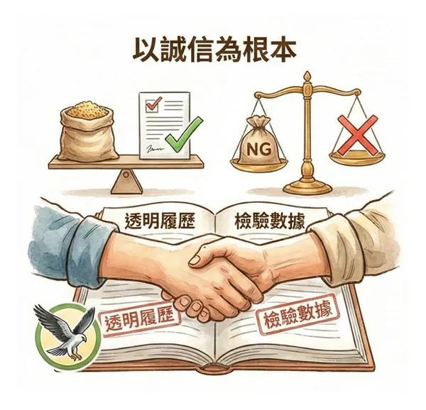 面對契作農友,我們堅守收購承諾;面對B2B合作夥伴,我們透明公開生產履歷與檢驗數據,好的原料我們與您分享,若品質未達標,我們寧可不產出,也不妥協,因為誠信是我們在市場立足的根基。